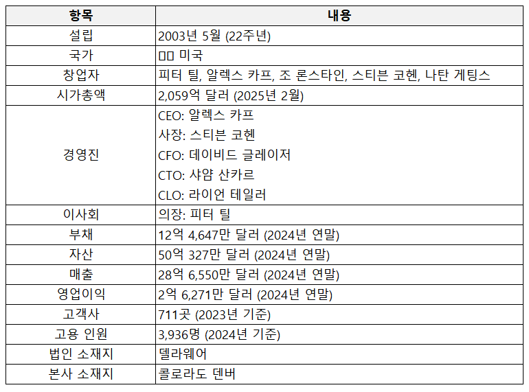 창업 배경은 9·11 테러 이후 "데이터로 테러를 예측할 수는 없을까"라는 문제의식에서 출발했습니다. 미국 CIA의 벤처 캐피털 인큐텔이 초기 자금을 댔고, 이후 FBI, NSA, 국방부 등 주요 정보기관과 협력하며 성장했습니다.