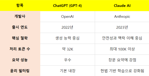 두 모델은 모두 뛰어난 생성형 AI지만 클로드는 긴 문서 처리, 윤리성, 사용자 중심 요약에 더 초점을 맞추고 있습니다.