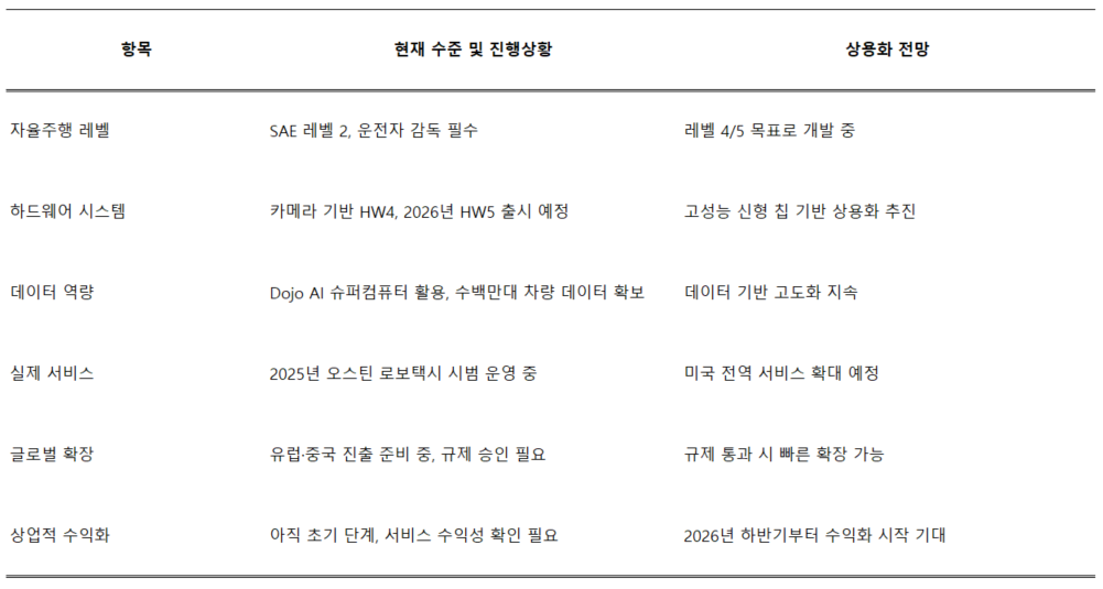 2026년 하반기 이후에는 실제 수익 창출 모델로 전환될 가능성이 크지만, 2025년까지의 성과에 따라 방향성이 결정될 것입니다. 테슬라는 전기차 제조사를 넘어 AI·로보틱스 기업으로의 진화를 꾀하며, 시장과 규제 환경의 변화에 따라 그 성공 여부가 결정될 것입니다.