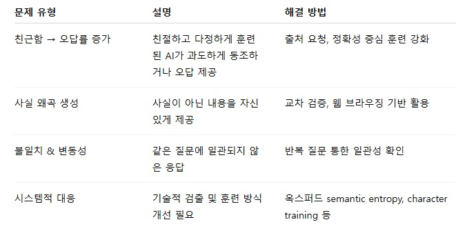 또한 최근 연구에서는 “친근하게 훈련된 AI가 그렇지 않은 버전보다 최대 30% 더 많은 오류를 내는 경향”도 밝혀졌습니다. 이는 AI가 다정하고 공감하도록 설계되면서 “사실보다는 사용자가 듣기 좋은, 동조적인 대답”을 우선하게 되었기 때문인데요.